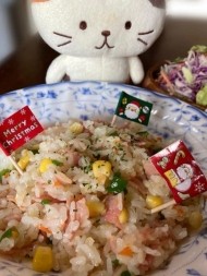 なんとなく世間の波に乗って、今日の夕飯は炒めピラフのクリスマス雰囲気風♪