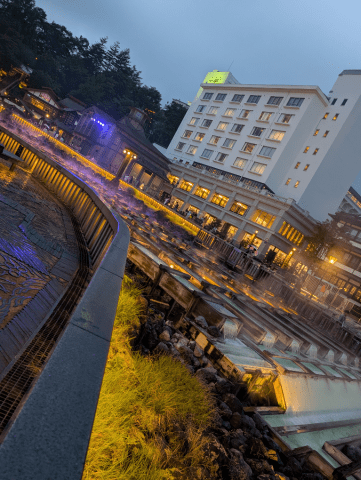 広い公園の中を水の流れではなくて、温泉の流れ